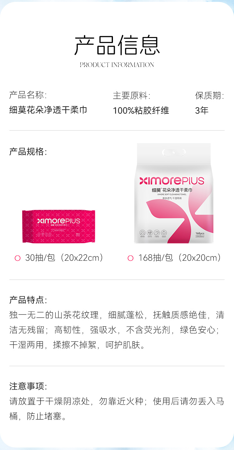规格1:30抽/包*3包 规格2:30抽/包*6包 规格3:168抽/包*1包 规格4:168抽/包*2包 山茶花纹理