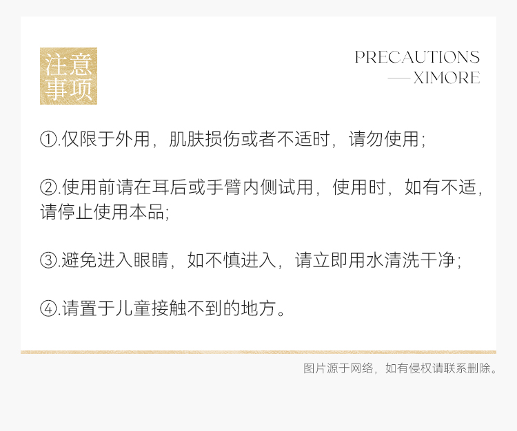 注意: 1.仅限于外用,肌肤损伤或者不适时,请勿使用 2.使用前请在耳后或手内侧试用,使用时,如有不适,请停止使用本品 3.避免进入眼睛,如不慎进入,请立即用水清洗干净 4.请置于儿童接触不到的地方。