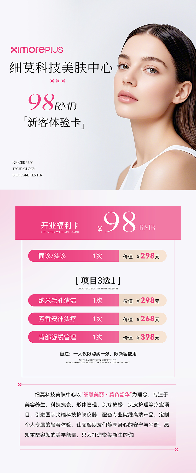 每个项目都包含:面诊/头诊 一次 规格1:纳米毛孔清洁 一次 规格2:芳香安神头疗 一次 规格3:背部舒缓管理 一次 备注:一人仅限购买一张,限新客使用